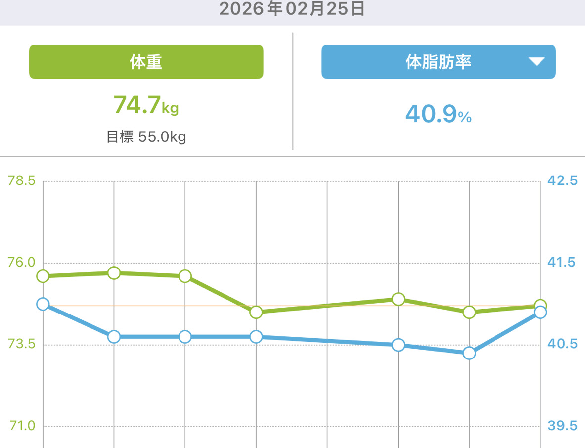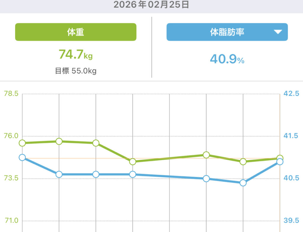 身長164.5cm 現在の体重 74.7㎏ 体脂肪率40.9%